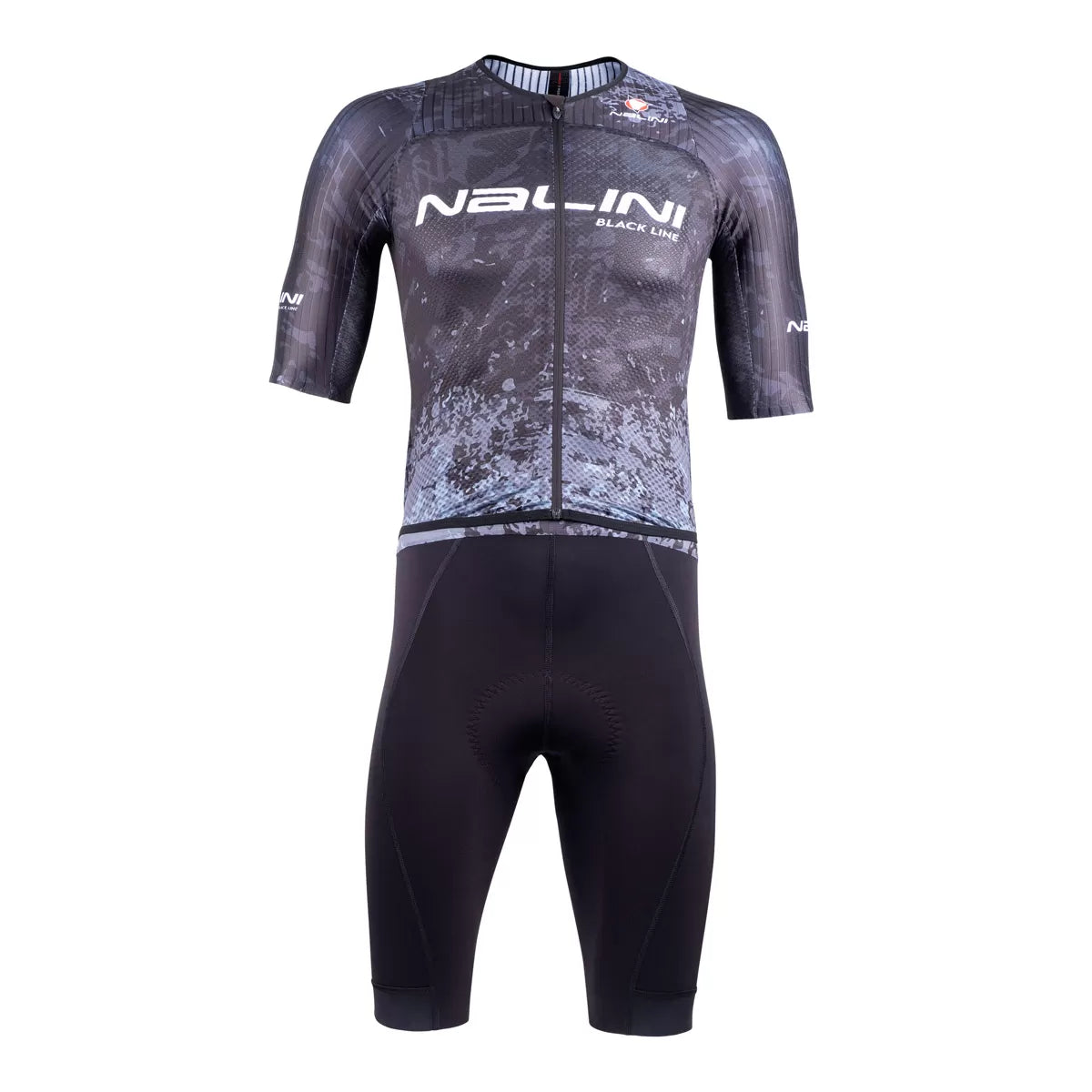 Ergonomic road body suit using aerodynamic, three-dimensional fabrics on the shoulders and sleeves, with a breathable mesh bodice and back made from 40-gauge fabric.